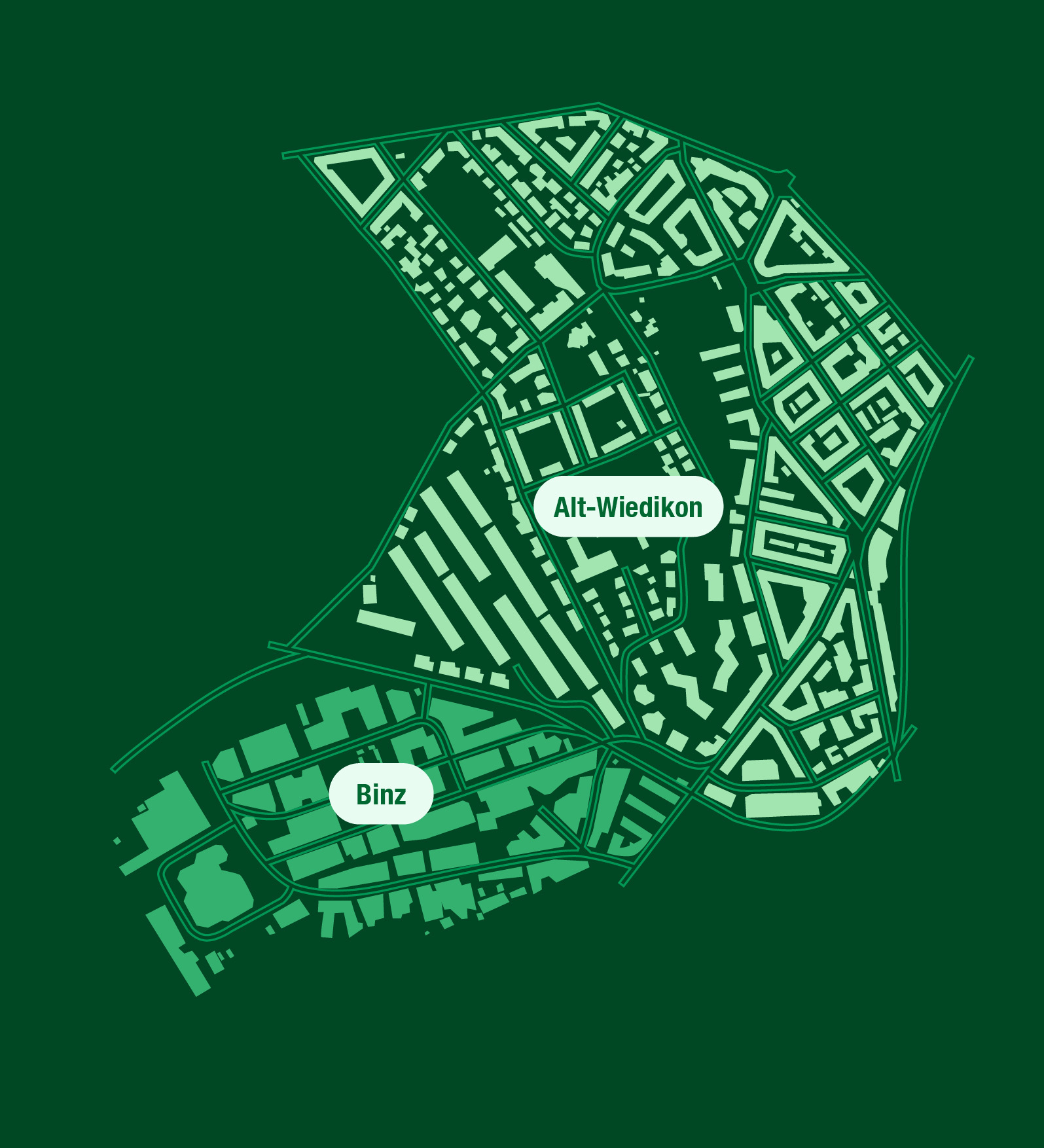 Binz und Alt-Wiedikon wurden ausgewählt, weil sich hier unterschiedliche Nutzungen (Wohnen, Gewerbe, Industrie und Bildung) auf engem Raum vermischen. Das macht das Quartier zu einem idealen Ort, um neue Ansätze in der Praxis umzusetzen – gemeinsam, lokal verankert und mit Blick auf die ganze Stadt.
